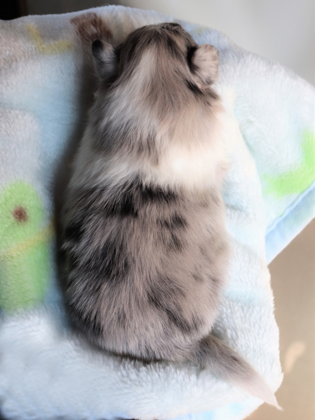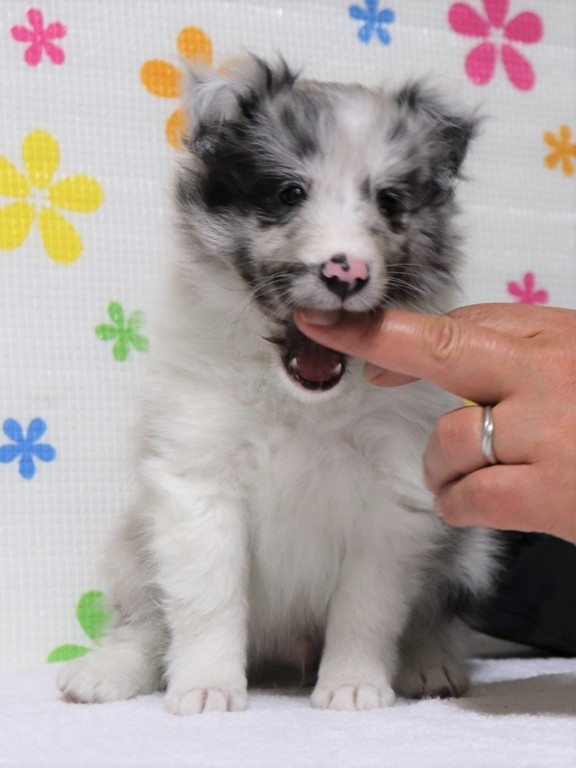 ネットブリーダーズを拝見し、バイブルーで青い目の子犬「銀くん」に一目ぼれしました。また、平山ブリーダー様の口コミがとても良かったこともあり、不安なく連絡をさせていただきました。お問い合わせ後すぐに丁寧な返信をいただき、見学の日程もスムーズに決まりました。 実際に伺うと、かわいいたくさんのシェルティちゃん達に迎えられ、たくさんの質問にも丁寧に答えてくださり、大変安心しました。お迎えした銀くんは、最初の1日はおとなしく心配になるほどでしたが、2日目からは甘えたり鳴いたりと元気を取り戻し、とても可愛い姿を見せてくれています。 平山ブリーダー様の元で大切に育てられてきたことがよく分かり、銀くんをお迎えできて心から良かったと思っています。 素敵なご縁をありがとうございました。(福島県 女性)