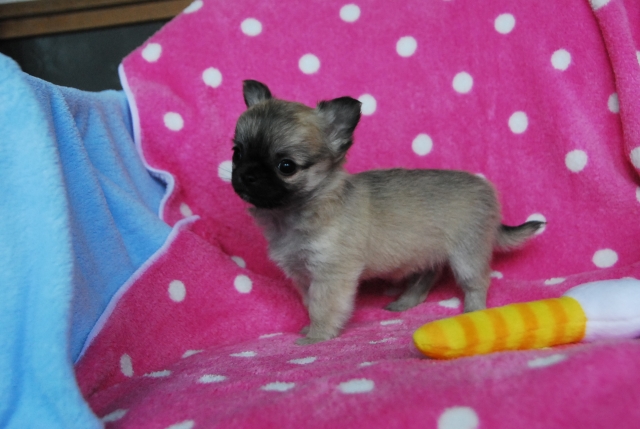 | コメント | 引き渡しは、2018年1月下旬の予定です。1回目のワクチン接種後となります。 (母犬と十分に過ごした状態でお引き渡しを希望していますので、ご理解お願いします) 2017年12月25日: 体重334g。兄弟の中で一番小さい子です。這って動くようになりました。 毛色は、レッド系のフォーン(写真では光の影響でレッドに見えます。動画の色が実際の色に近いです) 顔周りの黒の被毛は、成長と共に薄くなります。 2018年1月2日: 体重388g。離乳食中です。食欲も旺盛です。 兄弟の中で一番小さい子ですが、一番最初に寝室から出てケージの出入り口で遊んでいます。 撮影でケージの外に出すとまだ恐怖心があるようですが、徐々に色々な物に興味を示すと思います。 顔周りの黒の被毛の一部に白色の被毛が見え始めました。 2018年1月9日: 体重500g。 離乳食も終わり、母犬と同じフードを食べる様になりました。3兄弟で一番小さな子ですが、食欲は旺盛でいつも最後まで食べています。 ケージの中では活発に遊んでいますが、ケージの外はまだ慣れていないので様子を伺いながら行動範囲を広げています。 しばらくすると慣れてケージの外でも歩き回ると思います。 光の関係で毛色がレッドに見えます。レッドが入ったフォーン色です。兄弟の中ではレッド色は一番薄いです。 写真よりも動画の方が実際の毛色に近い色です。 2018年1月17日 体重が624gになりました。 ケージの外でも歩き回る様になりました。 狭い場所が好きな様で自由にするとすぐにキャスターの下の隙間に潜り込んで遊んでいます。 他の兄弟犬と異なり一人で行動することが多く探検心が旺盛です。 |