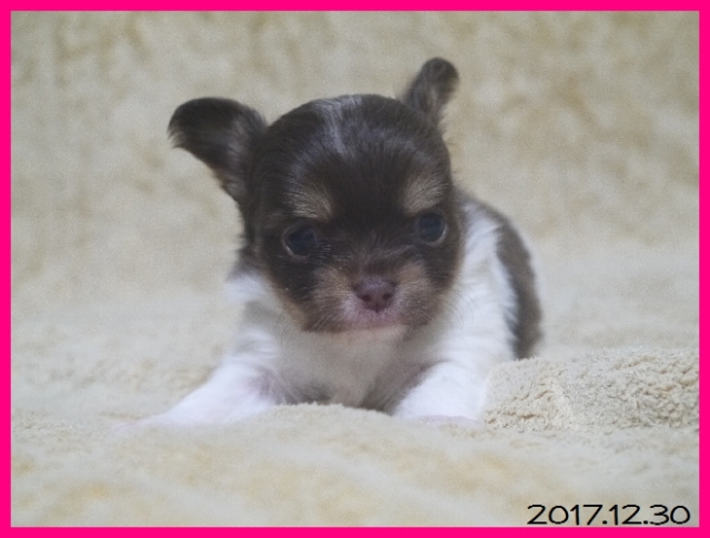| コメント | パパはJKCチャンピオン直子の北斗君。 ママはアメリカチャンピオン、カナダチャンピオン、JKCチャンピオン直娘のまりえちゃん。 ブラックタンホワイトの男の子とチョコタンホワイトの女の子の2頭兄妹で帝王切開で生まれました。 パパは体重2.5キロ。ママは2.2キロです。 血統も良く、性格も人懐こくてかわいらしい愛らしい両親から生まれたとても素晴らしい子犬ちゃんです。 2018年1月末頃にワクチン接種と健康診断を実施してからお引き渡しが可能となります。 ご予約やご見学もしていただけますので、お問い合わせをお待ちしております。 お正月期間でも大丈夫です。 お問い合わせをお待ちしております。 素敵なご縁ありますように・・・・・ |