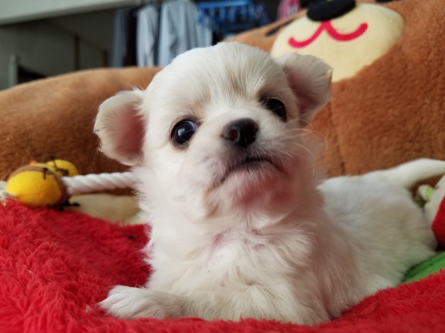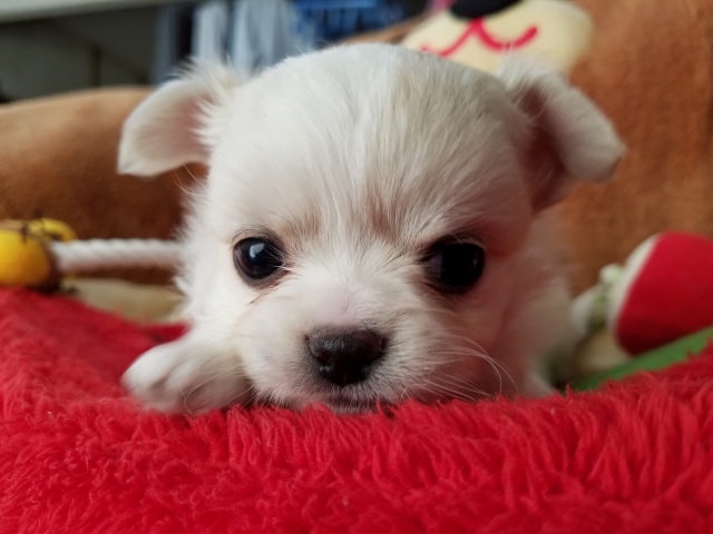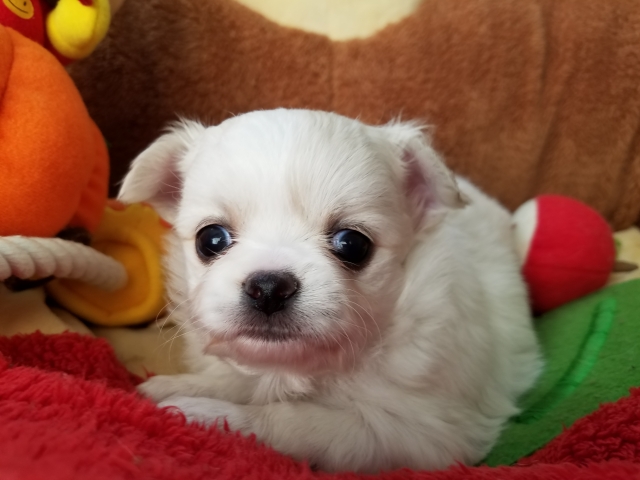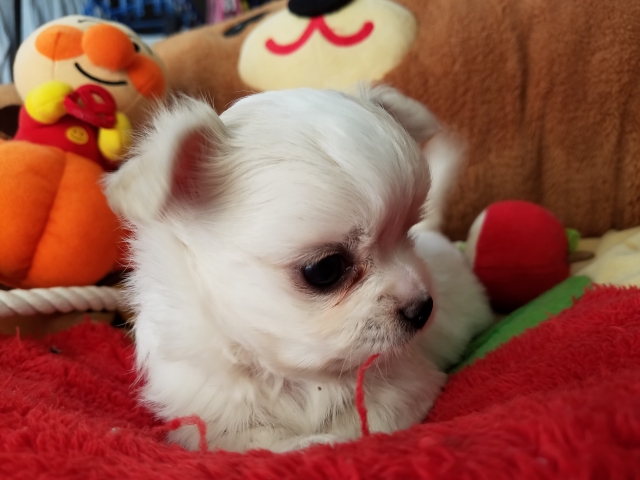 | コメント | 明るい性格の両親から生まれた、おっとりした性格の子です。 成犬時おおよそ2キロ前後予想です。 今は、ほとんど真っ白ですが、お顔にクリームのマーキングが出てくると思います。 写真より本物がもっと可愛いですので、ぜひ見学にいらしてください。遠方の方はお届け可能ですので、遠慮なくお問い合わせください。 優しい方とのご縁をお待ちしております。 |