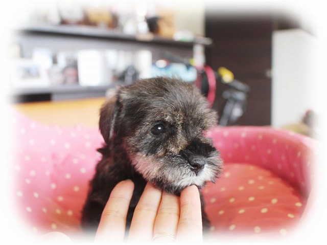 シュナウザーを主力にされているブリーダーさんだと認識しており、ボスちゃんはどうかなあと正直不安でしたがとても可愛く健康的なボスちゃんをいただきました。 掲載されていた写真より実物は想像以上に可愛くて即決し見学させていただいたその日に連れて帰りました。連絡をして、翌日行きますぅって勝手な申し出にも関わらず敏速かつ親切に対応して頂き大満足です。契約に対しても一つ一つ丁寧に説明してくださり、わかりやすかったです。この度は可愛いボスちゃんとのご縁をいただき、本当に有り難うございました。 (大阪府 女性)