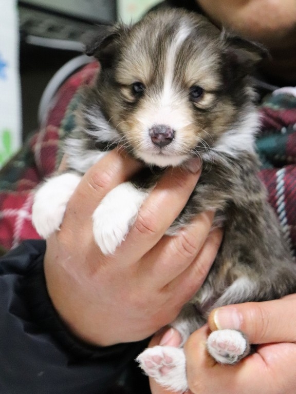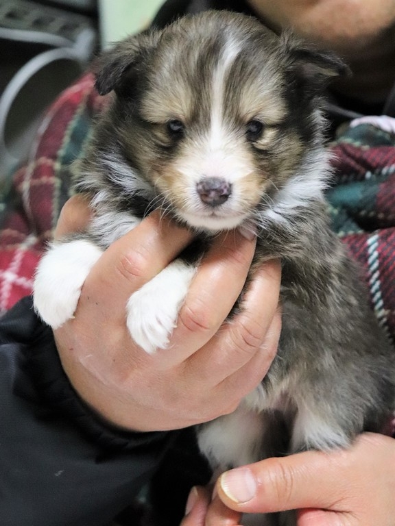 ネットブリーダーズを拝見し、バイブルーで青い目の子犬「銀くん」に一目ぼれしました。また、平山ブリーダー様の口コミがとても良かったこともあり、不安なく連絡をさせていただきました。お問い合わせ後すぐに丁寧な返信をいただき、見学の日程もスムーズに決まりました。 実際に伺うと、かわいいたくさんのシェルティちゃん達に迎えられ、たくさんの質問にも丁寧に答えてくださり、大変安心しました。お迎えした銀くんは、最初の1日はおとなしく心配になるほどでしたが、2日目からは甘えたり鳴いたりと元気を取り戻し、とても可愛い姿を見せてくれています。 平山ブリーダー様の元で大切に育てられてきたことがよく分かり、銀くんをお迎えできて心から良かったと思っています。 素敵なご縁をありがとうございました。(福島県 女性)