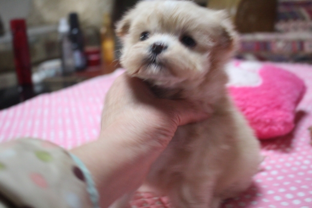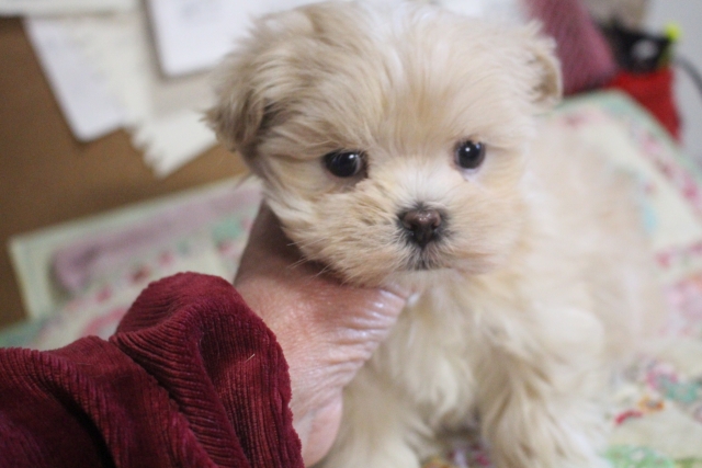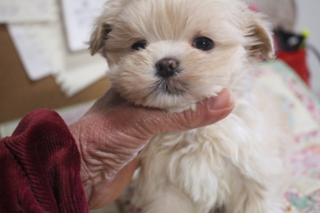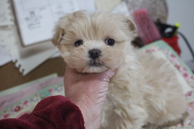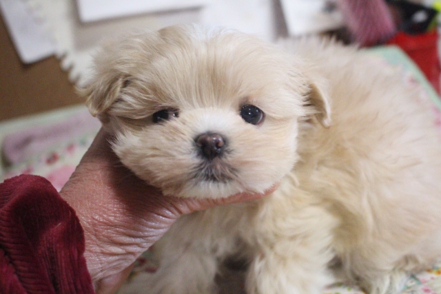 | コメント | 父親 マルチーズ 1.8kg 母親 プードル 2.5kg 1人っ子です。 まん丸いお顔のかわいい子。 毛が、とても多くてフワフワしています。 現在お鼻の1部薄いですが徐々に黒くなってくると思います。 マルプーちゃんお問い合わせお待ちしております。 |