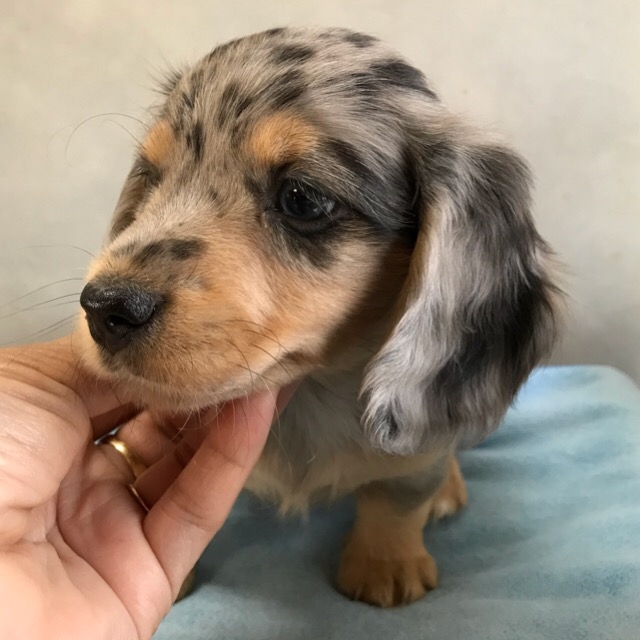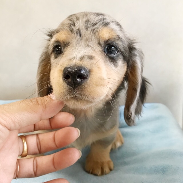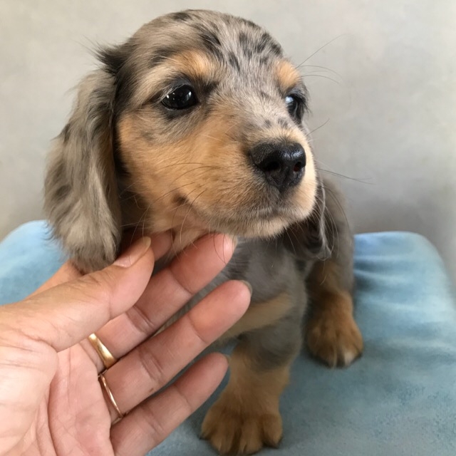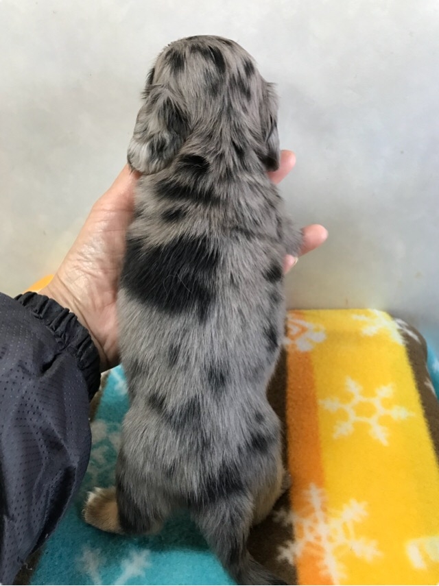 | コメント | お問合せ・ご予約承ります。 ダップルの柄が鮮やかで華のある可愛い男の子です。 成長過程は随時更新していきます 骨太で体高が低く、ずっしりした子です。 今は子犬らしい健康的なムッチリくん。 一部分ブルーアイです。 左足の先がほんの少しだけ白いカラーありです。 お問合せやご質問は、遠慮なくお気軽にどうぞ☆ |