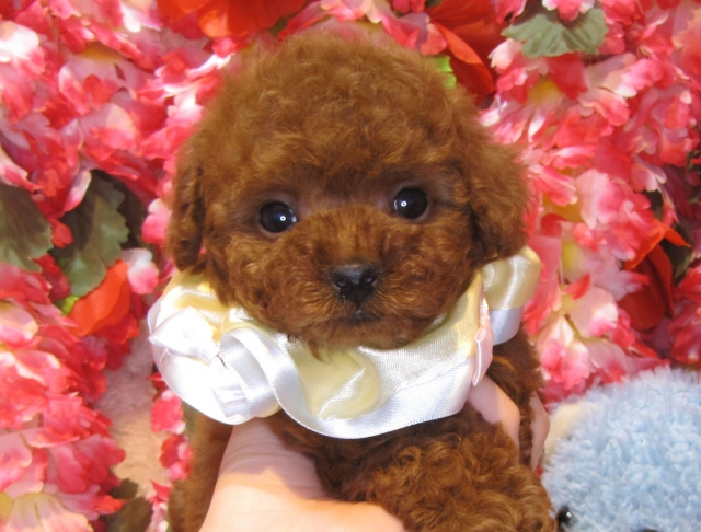 | コメント | タイニーサイズ見込みのかわいい女の子です。 濃いレッドで毛量が多くて巻き巻きの毛質になります。 小柄ですが元気でアピール上手な女の子です。 生後55日の体重は450グラム。 成犬時の予想体重は2~2.5キロのタイニーサイズ見込みの小柄な女の子です。 巻き巻きの毛質で 将来はテディーベアが似合うかわいい子になります。 シャンプーなどで使用する、子犬用スリッカーブラシもサービスしております。 各種カードもご利用できます。 父親 : 1.8キロ レッド 母親 : 2.5キロ レッド 現在たくさん生まれて25匹ほどおりますので、ぜひぜひ見学においでください。 最近トイプードルで目が白濁して失明に至る、遺伝性のPRAが流行っていますが、うちの犬舎では一件も出てませんのでご安心ください。 うちの子犬は全員トイレのしつけ済み。見学に来た人は「ちゃんとトイレでしてるーっ。おりこうだねー。」と皆さん感心していらっしゃいます。 もちろんこの子たちもできています。 ペットショップなどで見かける、ウンチの上で平気で寝ているような子犬を飼うと、おうちでのトイレのしつけはかなり難しくなります。 犬は心のパートナー。 「吠えない、噛まない、かじらない。」は室内犬として絶対条件です。 先日「別のペットショップでトイプードル飼って1ヶ月。」 という奥様が飛び込みで来られましたが、「家中のものを噛んでソファーもテーブルの足もじゅうたんも、みんなボロボロにされて、最近は奥様の手も噛むようになってきて、怖くなってきた。」とたいへんお困りの相談に来られました。 その場でしつけ方のお話をさせていただきまして、5日後には子犬を連れてきて「やっと抱っこして出られるようになって、家の中でもいい子になりました。」とお礼に来られました。 子犬の性格にもよりますが、このような暴れん坊になってしまうこともあります。 絶対にこのような暴れん坊の犬に育ててはいけません。 うちでは基本的に子犬は必ず1匹ずつゲージに入れて展示しています。 2匹ずつケージに入れた状態で皆様のご家庭に1匹だけで飼われたときに、寂しさから夜中でもキャンキャン泣き続ける子犬がおりました。 そこで今では必ず1匹だけでケージに入れて置くようにしております。 これで「一人で生活する。」 ということに慣れた状態でお引渡しになりますので、皆様のお宅でキャンキャン泣いて騒がせることはほとんどなくなりました。 家庭や一般社会の中でみなさんにほめられる、すばらしい犬。 最高にマナーの良い犬に育てられるよう、お引き渡しの前には必ず1時間ぐらい 「子犬の飼い方しつけ方」 のお話をさせていただきます。 犬の気持ちや本能が理解できて、必ずいい子に育てられます。 ご家族全員でおいでいただけましたら幸いです。 場所は簡単です! 茨城県龍ヶ崎市。お車の方は常磐高速→ 圏央道2つ目(牛久阿見龍ヶ崎)を降りたらどこも曲がらず一直線に8~9キロ。左に看板が見えてきます。 東京から1時間ちょっと。4車線の大通りに面しているのでカーナビ一発で来ます。 電車の場合は常磐線佐貫駅東口。決まらなくても駅まで必ず送迎しますのでご連絡ください。 見学ご希望があっても、別の方からご予約金の振込みなどがあった場合は、そちらに決まってしまう場合があります。 あらかじめご了承ください |