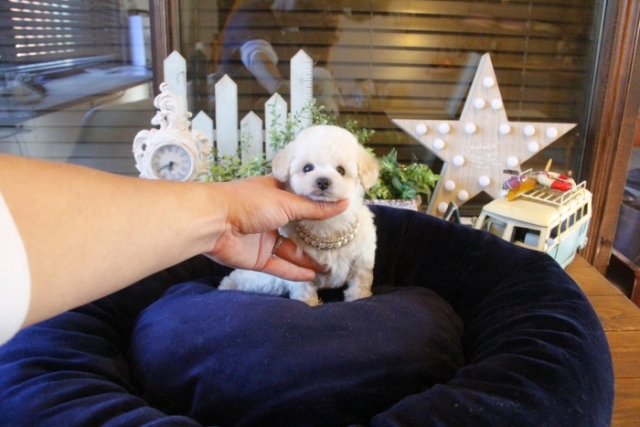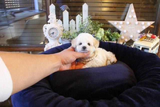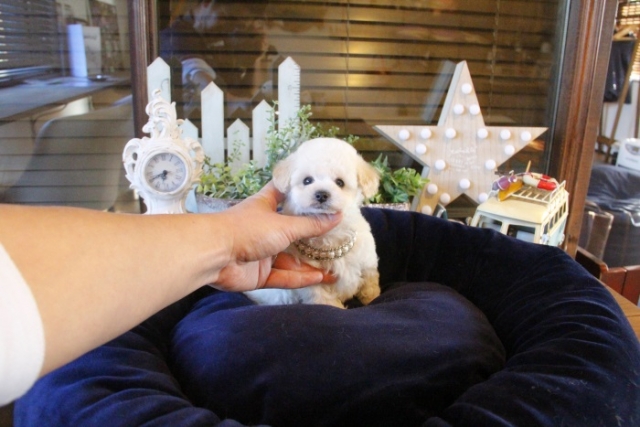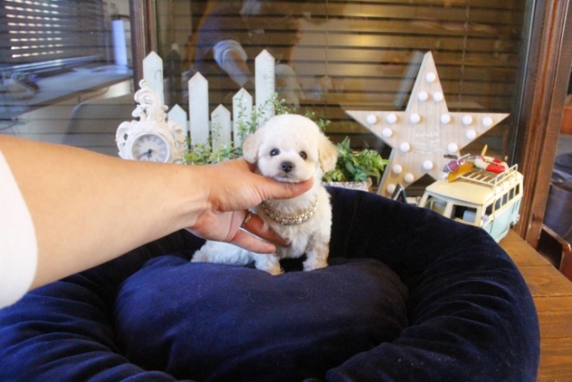 | コメント | 父1.2㎏ 母2.6㎏ マズルの短いくまさんタイプの女の仔です♪ 毛量は細かい毛質にみっしりと生えており瞳は 丸く耳が茶色いワンポイントタイプのシロクマちゃん 性格はおっっとりしたマイペースな性格で 初めての方でも飼いやすいいです。 特に寝相が可愛く変な寝方をしますよ♪ トイレのしつけもすでに完璧です♪ 気に入った方はお早目のお問い合わせを お勧めいたします。 生体ですので他の家族が先に決まってしまうことも 多々ありますのでご理解のほどよろしくお願いいたします 大人しく人懐っこい性格なので初めての方にも飼いやすい仔です☆ お留守番、夜鳴きはすでにしつけ済みです♪ ペットショップやオークション出しのブリーダーと違い欧米のブリーディング同様、親や兄弟と社会期を過ごさせることで 人間と暮らした時にスムーズに暮らせるようにしております。 親犬達も家族として朝7時からドックランで遊び、全室冷暖房完備の部屋で過ごし、専門のスタッフや専門学校の方々と協力し合いながら 衛生管理に努めております。 犬舎の特徴としましては、東京や神奈川近郊の為マンションのお客様が8割を占めます。その為小さな1キロから2.8キロまでに収まるように、 母犬を2.8キロまでと決めてブリーディングをしている為、後で極端に大きくなる子はいません。 瞳の丸く大きなところやマズル(鼻先)が短いもの特徴で、父犬、母犬、全て私が全国の可愛いトイプードルを一頭、一頭厳選して親犬としてブリーディングした子犬のみを掲載しております。 こだわりとしては、お客様がお迎えされた後、その子がTV出演、雑誌やカレンダーのモデルとして活躍の場が増え我が家を忘れないでいてもらいたい為、 本気でこだわりを持って常にトイプードルを飼うなら此処だと皆様全員に思われる犬舎でありたいと思います。 ありがたいことに今では、雑誌やTV出演、カレンダーなど多くの出身トイプードルちゃんたちが可愛く撮影されお客様からも喜びの声を頂いております。 我が家は35頭の小さな犬舎ではありますが、頭数が多いところでは管理が行き届かない、PRA若年性白内障などの遺伝性疾患の発症がないように努めております |