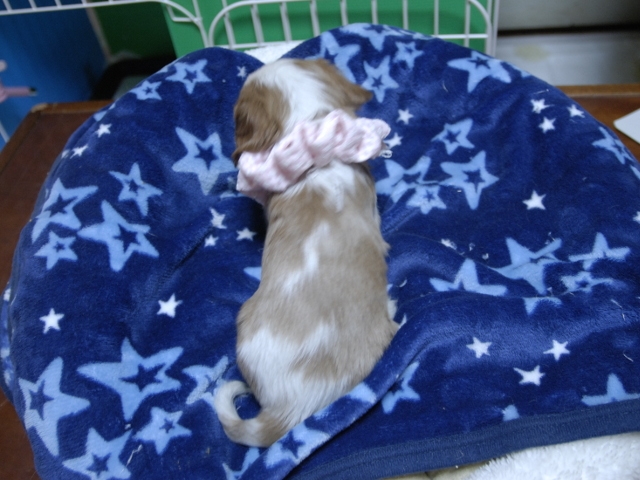 | コメント | お父さんはJKCチャンピオンの吉宗君、お母さんはチャンピオン直子ライザちゃんから生れたキュートな女の子です。(桃リボンちゃん) 健康状態は、問題有りません。 すくすく育っています。 |