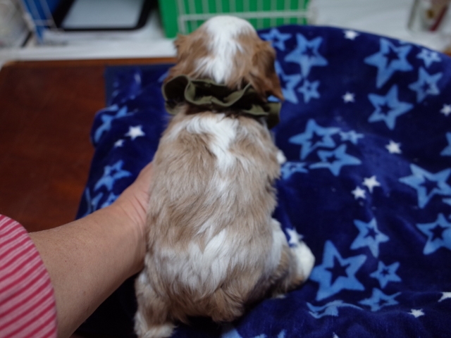 | コメント | お父さんはJKCチャンピオンの家斉君、お母さんはチャンピオン直子キャロルちゃんからダンディーな男の子です。(深緑リボン君) 健康状態は、問題有りません。 すくすく育っています。 |