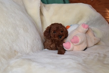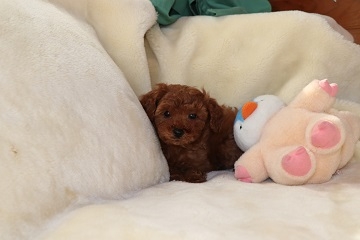 とっても可愛いトイプートルの女の子を譲って頂きました。モコと名前を付けて家族皆で可愛がってます。トイレはしつけ途中とおっしゃっていましたが、ちゃんとトイレまでトコトコ歩いていってした時はビックリしてキチンとしつけをしてくださっていたんだなぁと感激しちゃいました。性格も明るく元気で、先に飼っていたトイプーのお兄ちゃんとも仲良くやれそうです。モコの方が元気で時々お兄ちゃんは逃げ腰になってますけど。(^^;; 本当にこの度はありがとうございました。大切に育てますね。(鹿児島県 女性)