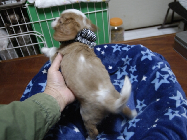 | コメント | お父さんはJKCチャンピオンの吉宗君、お母さんはチャンピオン直子インディーちゃんからダンディな男の子です。(黒リボン君) 健康状態は、問題有りません。 すくすく育っています。 |