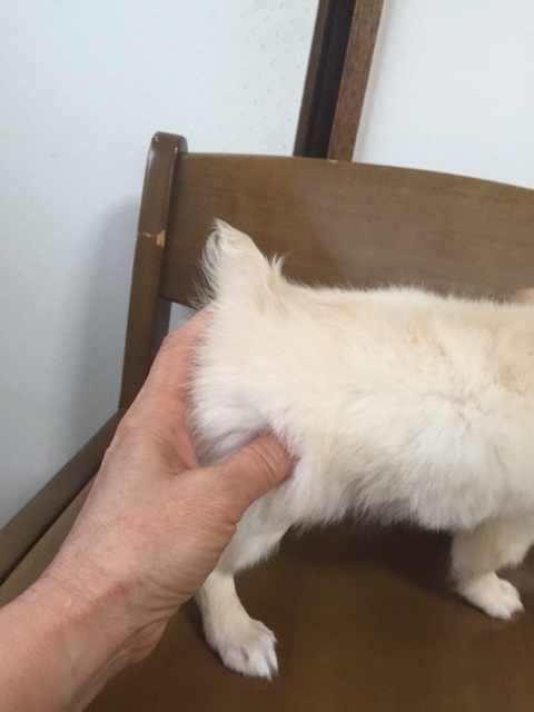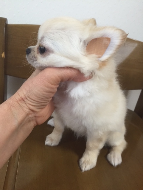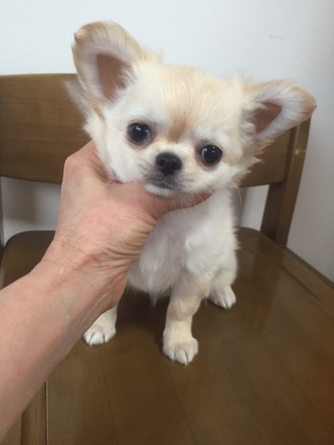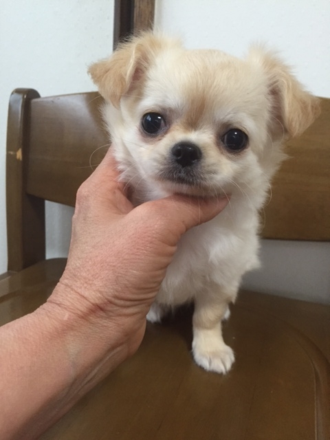 | コメント | タレ目で ふてくされてる様な目 困ってる様に見える表情が何とも言えないくらい可愛い子です。 大人になった時に子犬の頃と顔付きが変わってしまう鼻の伸びる様な化けるチワワではありません。 直角に チュンと付いた短いお鼻 短いマズルのまま この顔のままんまで大人になる子です。 可愛いのは、顔だけでなく性格も めちゃめちゃ懐っこく 明るく元気印 毎日、姉妹で活発に遊んでいます。 生まれた時は、3兄妹の中で一番小さく120g で生まれましたが 母乳を独り占めだった様で 一人すくすく育ち兄妹の中で一番 コロコロ、ムチムチ 横幅ガッチリに育ちました。 母乳を卒業しフードを食べだした現在も食欲旺盛 毎食、凄い速さでモリモリ食べてくれます。 パパ JKC チャンピオン直子 トライ ママ クリーム 噛み合わせ他、身体的な欠点はありませんが ママのお腹の中にしっぽを半分忘れて来た様で短いです。 それも この子の個性として受け止め可愛がって頂ける方に巡り逢える事を願ってます。 短いしっぽを思いっきり振ってくれる姿も可愛いですよ^^ 3/19 健康診断&ワクチン接種して貰いましたので 何時でもお引渡し出来ます。 「お願い」 当方、ペットショップではありません。 興味本位の見てみたい、触ってみたいだけのペットショップ感覚での見学 ペットショップ、他ブリーダーさんよりの続けての見学は 伝染病予防の為、お断りいたします。 ご家族で良く話し合われた上で お問い合わせ頂けます様 お願い致します。 |