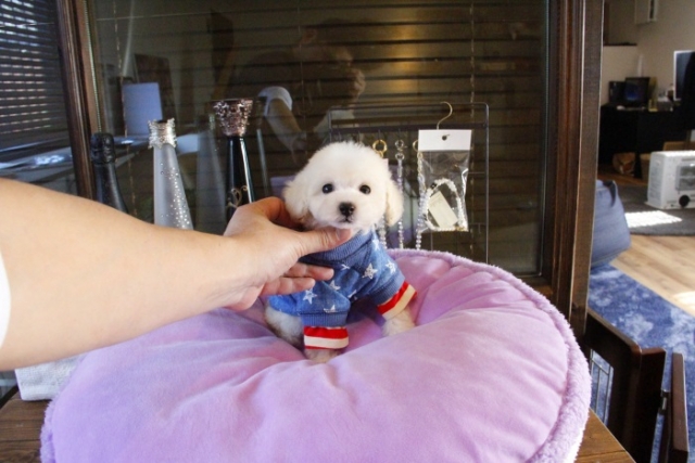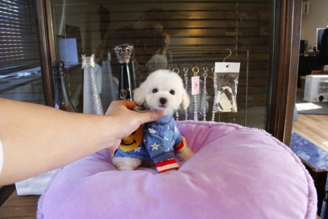 ネットでの契約となり、引き渡しまで会えませんでしたが丁寧に対応して頂きました。契約までは、小さなことでも質問に答えてもらいまた契約して引き渡しまで時間がありました。成長過程や様子など写真を送って頂いたりと細かい部分まで対応して頂きました。受け渡し当日は、遠方からだったため不安でしたが到着してすぐに顔をみたら元気いっぱいでした。また、お顔なども一目惚れした通りにわんちゃんでした。引き渡し後も質問にのって頂き感謝感謝です。これからもよろしくお願いします。(熊本県 女性)
