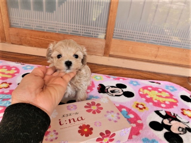 兵庫県から飛行機とレンタカーを利用しお迎えいただきました。 車ご利用でのお迎えは、子犬の不安や初めての遠距離車移動での車酔いを防ぐ為に、運転手以外の方で膝に抱きコミュニケーション取りながらとお願いしましたら、他県にお住まいのご実家ご両親と共にお迎えいただきました。子犬を思いやるお優しいご家族に心から感謝でいっぱいです。ありがとうございます。 犬を飼うのは始めてということで、色々と分らないことがいっぱいの様子でお迎え前も後もご質問いただきご熱心さにも感謝でした。上手に接してくださり子犬も不安無く直ぐにご家族に馴染んだとのこと。ご主人様もより帰宅が楽しみになったそうです。ココちゃんとぴったりの可愛い命名のマルプー女の子で動画や写メでも愛情がいっぱい注がれていることが分る愛らしいお顔になっています。健康長生きできる欠陥の無い健康優良児です。これからもより健康で、楽しいペットライフの応援をさせていただきます。末永く宜しくお願いいたします。(2023年05月26日 19時21分)