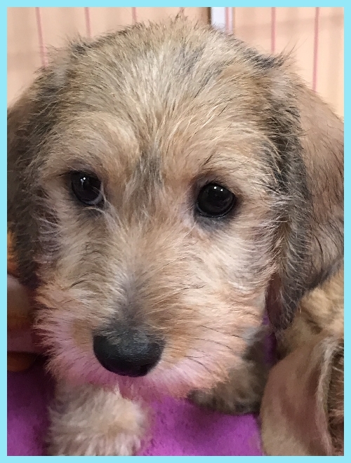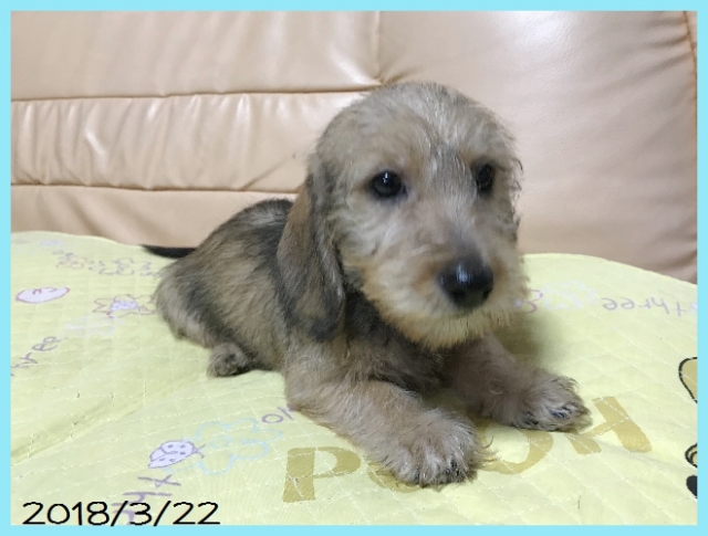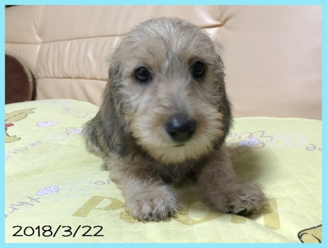 | コメント | とってもかわいいミニチュアワイヤーダックスの男の子です。 パパはカニンヘンワイヤーダックスのJKCチャンピオン。 ママはミニチュアワイヤーダックスでカニンヘンサイズです。 血統書はミニチュアとなりますが、サイズ的には小ぶりなサイズです。 欠点などもなくとても愛らしいぼくちゃんです。 ワクチン接種と健康診断済みですので、見学していただいた日にお迎えも可能です。 お問い合わせをお待ちしております。 |