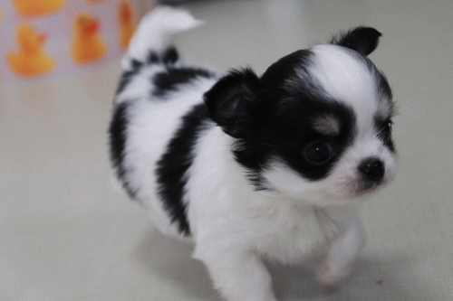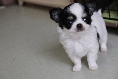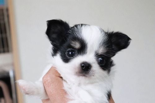| コメント | 体はホワイト&ブラックですが、お顔にタンが入っているトライカラーです。 優しいお顔のハンサム君♥ 4/1現在の体重は409g しっかりタイプですので、始めてチワワを飼われる方にも 安心なサイズです! パパ ブラックタン&ホワイト 2.7キロ ロング ママ トライ 2.5キロ スムース |