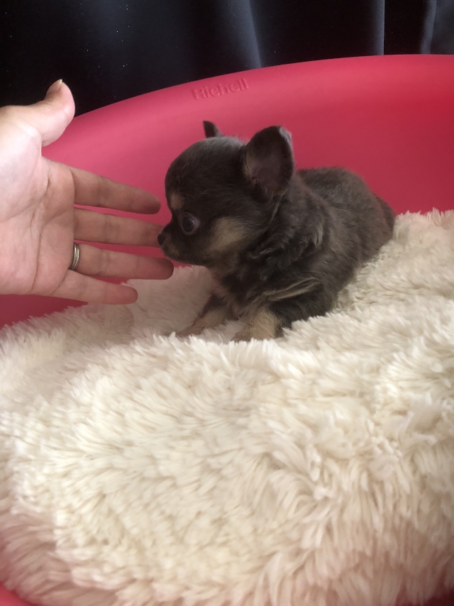 評価が遅くなり申し訳ございません。見学の予約申し込みからスムーズにやり取りさせていただきました。実際お会いしてすごくチワワ愛に溢れる方でした。パパチワワちゃんとママチワワちゃんもこちらからお願いする前に紹介してくださったりと、とても安心してお話を進めることができました。我が家に着くまでは大人しかった子ですが、家に着いてからは家族全員に尻尾を振って改めて元気にご挨拶してくれました。このたまらなくかわいい愛嬌も田所ブリーダーさんの元で愛情たっぷりに可愛がってもらっていたからだと思います。良い子とのご縁をいただき感謝です。(神奈川県 女性)
