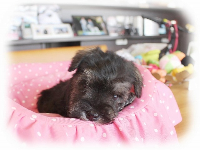 見学の申し込みからの対応も凄く良くて、当日の応対も非常に親切に的確に対応して貰えました。その場で直ぐにこの真摯な対応ができる人が繁殖させたワンコなら心配ないと思ったので内金を払い2週間後の昨日ワンコを引き取ることに致しました。ワンコを連れて新幹線に乗るのは初めてだったのでどんなもキャリーケースを用意して良いのか判らなかったので、準備をお願いしておいたところちゃんとした物を用意しておいてくれました。書類の説明や今後の飼い方その他に付いても質問にも丁寧に受け答えをしてくれて有難かったです。引渡し前にちゃんとシャンプーもされていたらしく良い匂いでした。この子でシュナウザーは4頭目ですが、今までにはこれほど手厚い対応をして貰ったのは初めてです。有り難うございました。(東京都 男性)