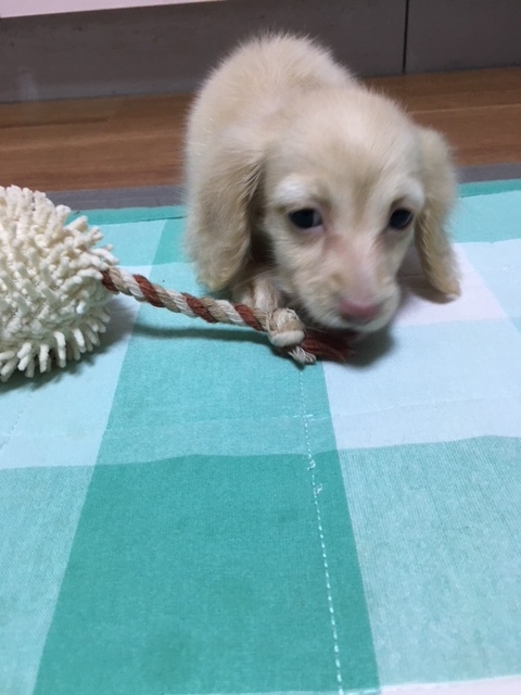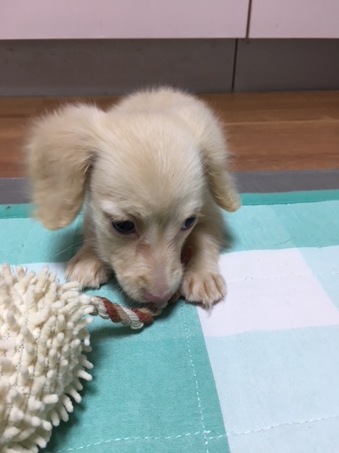 | コメント | 父 カニンヘン クリーム 2.8kg PRAノーマル 母 ミニチュア クリーム 3kg カニンヘンサイズ お母さんも 小ぶりなので仔犬も小ぶりですよ。 毛色もとってもきれいです。 小さいながらも ご飯を食べています。 姉妹でジャレ合って遊んでいますよ。 お気軽にお問い合わせください。 |