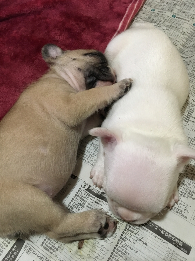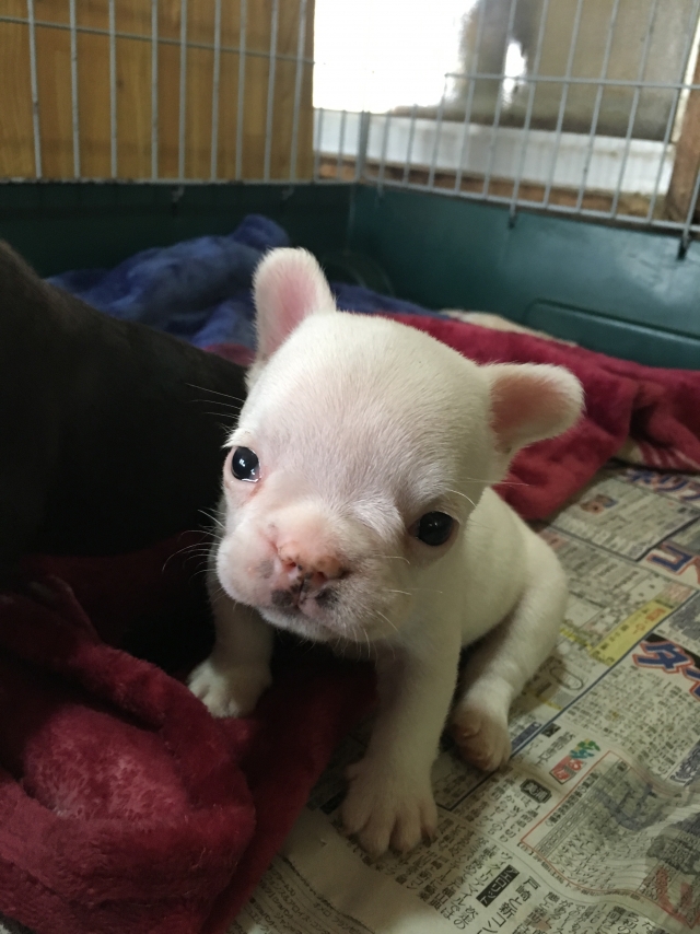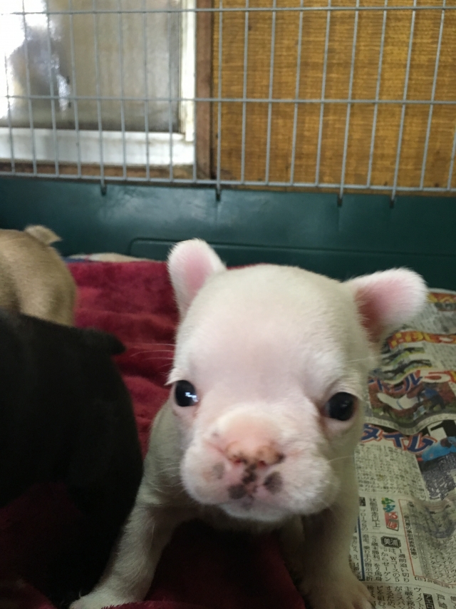 | コメント | 父犬ブリンドル、母犬パイドから産まれた3人兄妹のホワイトの男の子です。 現在は昼間は兄妹たちとご飯をたくさん食べ、よく遊び、よく寝て 夜はお母さんのお乳を飲み、順調に成長しています。 見学はいつでもできますのでお気軽にお問い合わせください。 見学時間は午後1時~午後5時ごろまでです。 午前中の見学をご希望の方はお問い合わせ時にお伝えください。 |
