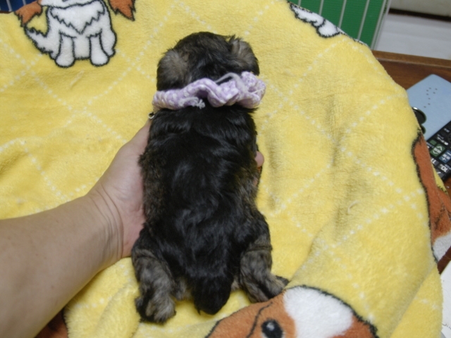 | コメント | 父JKCチャンピオンゼロ君(木村さん所有)、お母さんJKCチャンピオン直子エルザちゃんから生れた可愛いキュートな女の子です。(紫リボンちゃん) 現時点では、ヘルニア等の欠点は見当たりません。 |