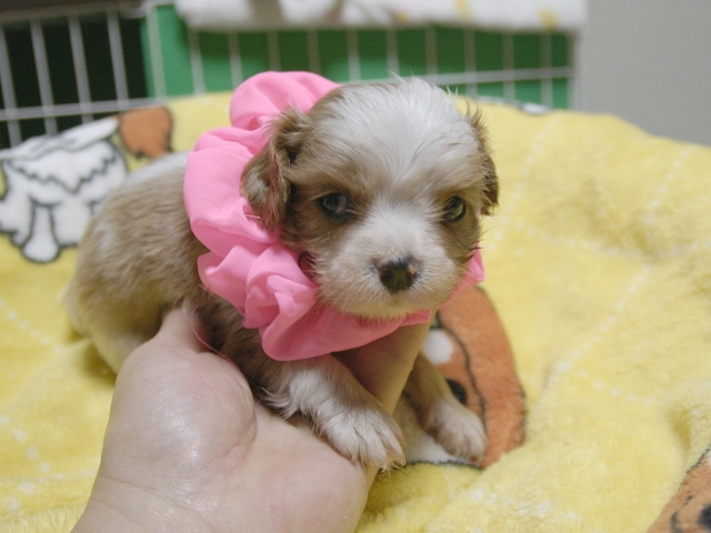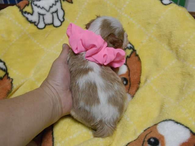 | コメント | お父さんはJKCチャンピオンの家斉君、お母さんはチャンピオン直子ジュンちゃんからキュートな女の子です。(桃リボンちゃん) 健康状態は、問題有りません。 すくすく育っています。 |