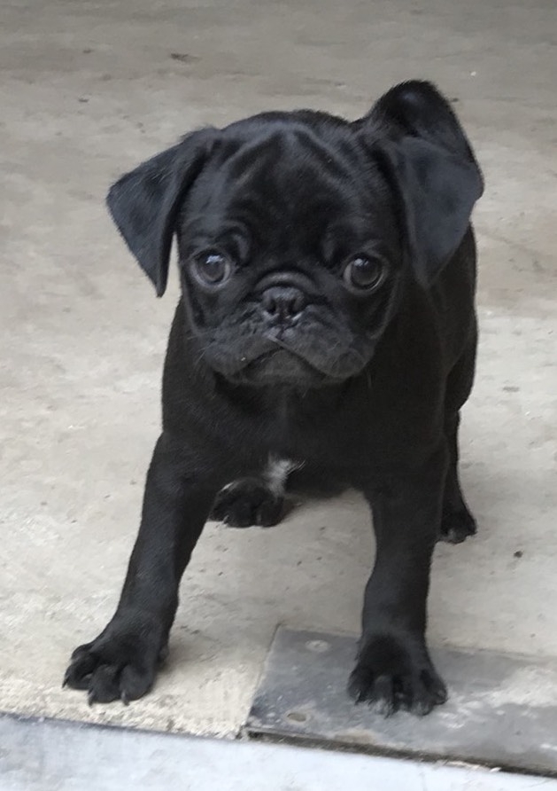 今日、黒パグ(雄)を見学に行きました。これまで、パグのフォーンとブラックを飼ってきましたが、どちらも雌でおとなしかったので、できれば雌がいいなという思いと、雄で大丈夫かなという不安があり、とりあえず見学のつもりで出かけました。見せて頂いた黒パグは表情豊かでとても可愛いく、本間さんとお話している間にすっかりなついてしまい、不安もなくなり購入を決めました。本間さんには、爪の切り方や耳そうじの仕方、歯磨きやえさの与え方、しつけまで丁寧に教えて頂きました。これまでは忙しくてきちんとしつけができなかったので、とても参考になりました。そのまま連れて帰りましたが、夜帰宅した夫も息子も新しい家族をみてとても喜んでいました。本間さん、本当にありがとうございました。(栃木県 女性)