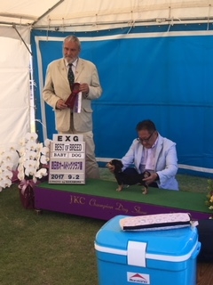 | コメント | 父犬チャンピオン、祖父犬インターナショナルチャンピオン、曾祖父イギリスチャンピオンの血を引いたイギリス系のミニチュアダックスです。 性格も小さな時はやんちゃですが大人になると本当おとなしく無駄吠えも無くお利口さんです。 イエローですが色素は濃いです、当犬舎はメスのクリームのソリッドカラーはブリーディングから外していますしかし、シェーデッドからソリッドになった犬はブリーディングいたします。 |