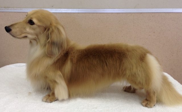| コメント | 父犬チャンピオン、祖父犬インターナショナルチャンピオン、曾祖父イギリスチャンピオンの血を引いたイギリス系のミニチュアダックスです。 性格も小さな時はやんちゃですが大人になると本当おとなしく無駄吠えも無くお利口さんです。 イエローですが色素は濃いです、当犬舎はメスのクリームのソリッドカラーはブリーディングから外していますしかし、シェーデッドからソリッドになった犬はブリーディングいたします。 |