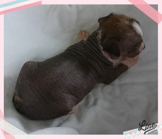 | コメント | 父、ヘアレス 母、パウダーパフ ヘアレスでも頭の毛も少なく、足先もほとんど毛ありません。 尻尾は多少の毛はあります。 そんな女の子です~ 体も剃らなくてよさそうなのでお手入れは、超~簡単ですよー とても甘えん坊な犬種ですよ❗ 詳しくは、お問い合わせください。 |