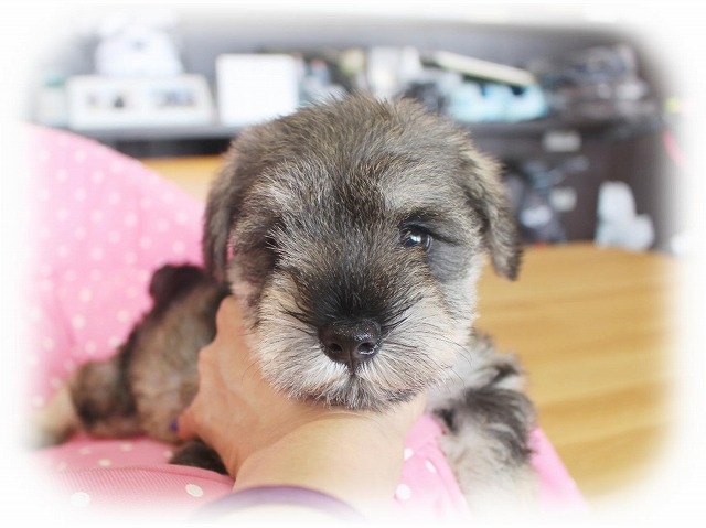 シュナウザーを主力にされているブリーダーさんだと認識しており、ボスちゃんはどうかなあと正直不安でしたがとても可愛く健康的なボスちゃんをいただきました。 掲載されていた写真より実物は想像以上に可愛くて即決し見学させていただいたその日に連れて帰りました。連絡をして、翌日行きますぅって勝手な申し出にも関わらず敏速かつ親切に対応して頂き大満足です。契約に対しても一つ一つ丁寧に説明してくださり、わかりやすかったです。この度は可愛いボスちゃんとのご縁をいただき、本当に有り難うございました。 (大阪府 女性)