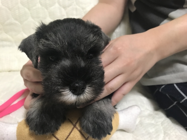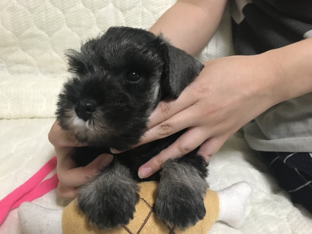 以前 2匹のわんこと暮らしていましたが立て続けに亡くしてしまい立ち直れずにいたのですが、もう一度わんことの生活を望み次に一緒に暮らす子もミニシュナと考えだした時に福井さんの仔犬に目が留まりました。 急な見学希望にも気持ちよく応じていただきました。お会いするまでに福井さんのミニチュアシュナウザー達を見ていて、かっこいいなぁと思っていました。仔犬が気に入ったのはもちろんですが決め手は福井さんとの会話で感じた人柄です。 本当に犬が好き、ミニシュナが大好きなんだなと感じました。 約20後の受渡日には 随分成長した仔犬をみて感激しました。 我が家に着いてすぐにトイレでおしっこをするとその後はうんちもも失敗せずにできています。急な環境の変化なのに鳴き続けることもなくゲージ内で機嫌よく遊んでいます。 可愛くて元気いっぱいの仔犬を譲って頂いた福井さんに感謝しています。(兵庫県 女性)