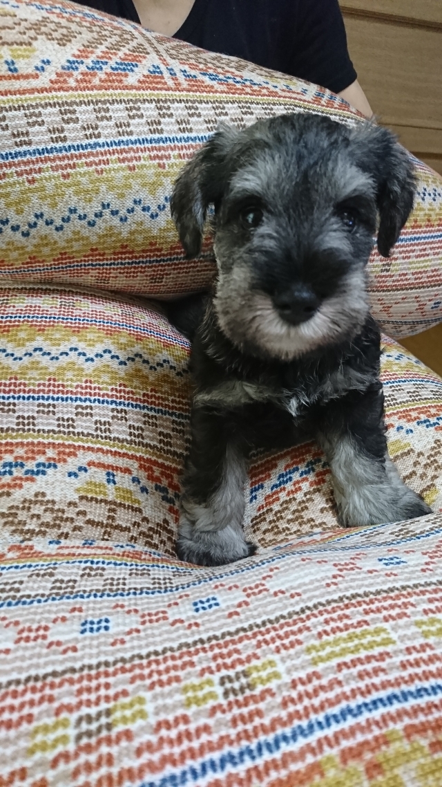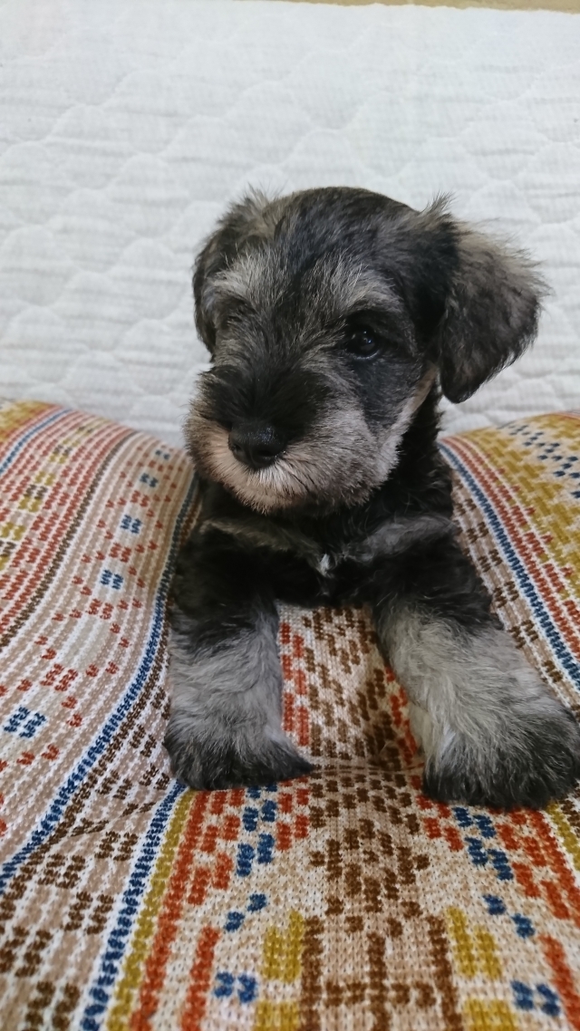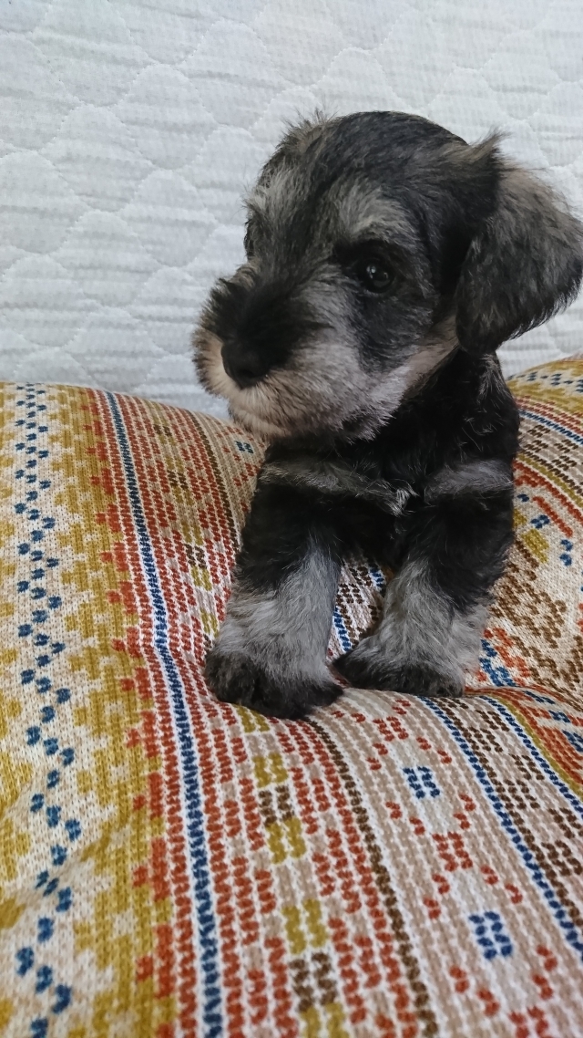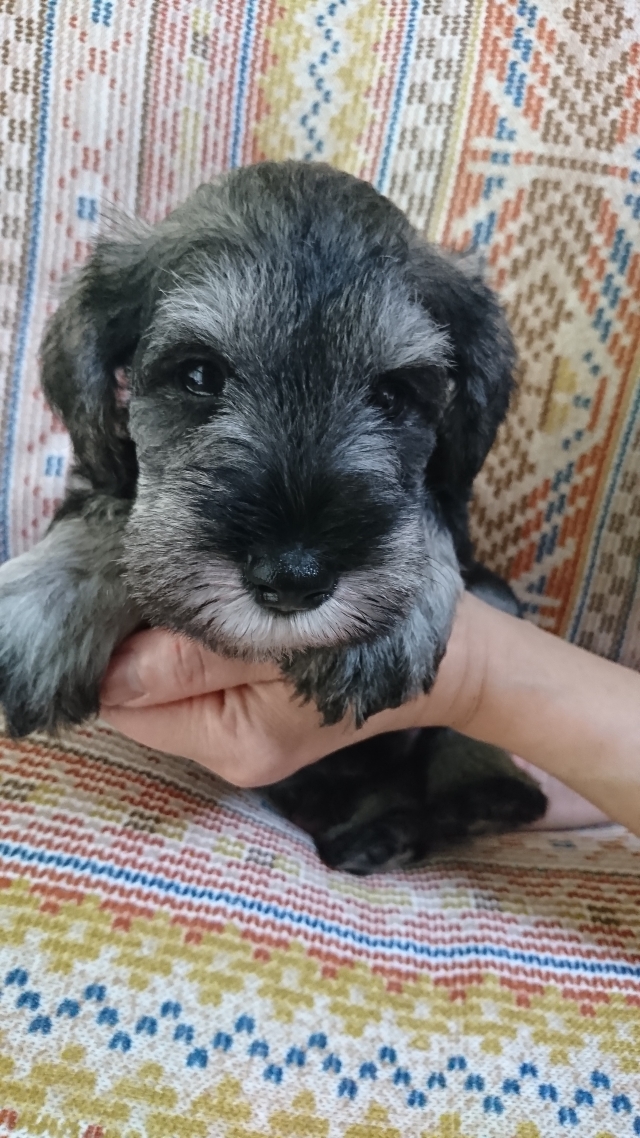 以前 2匹のわんこと暮らしていましたが立て続けに亡くしてしまい立ち直れずにいたのですが、もう一度わんことの生活を望み次に一緒に暮らす子もミニシュナと考えだした時に福井さんの仔犬に目が留まりました。 急な見学希望にも気持ちよく応じていただきました。お会いするまでに福井さんのミニチュアシュナウザー達を見ていて、かっこいいなぁと思っていました。仔犬が気に入ったのはもちろんですが決め手は福井さんとの会話で感じた人柄です。 本当に犬が好き、ミニシュナが大好きなんだなと感じました。 約20後の受渡日には 随分成長した仔犬をみて感激しました。 我が家に着いてすぐにトイレでおしっこをするとその後はうんちもも失敗せずにできています。急な環境の変化なのに鳴き続けることもなくゲージ内で機嫌よく遊んでいます。 可愛くて元気いっぱいの仔犬を譲って頂いた福井さんに感謝しています。(兵庫県 女性)