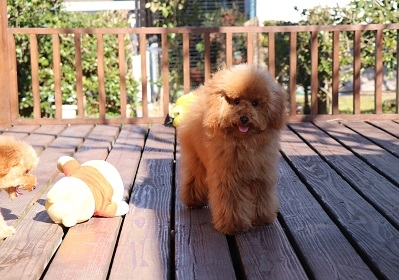 とっても可愛いトイプートルの女の子を譲って頂きました。モコと名前を付けて家族皆で可愛がってます。トイレはしつけ途中とおっしゃっていましたが、ちゃんとトイレまでトコトコ歩いていってした時はビックリしてキチンとしつけをしてくださっていたんだなぁと感激しちゃいました。性格も明るく元気で、先に飼っていたトイプーのお兄ちゃんとも仲良くやれそうです。モコの方が元気で時々お兄ちゃんは逃げ腰になってますけど。(^^;; 本当にこの度はありがとうございました。大切に育てますね。(鹿児島県 女性)