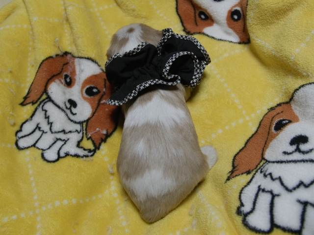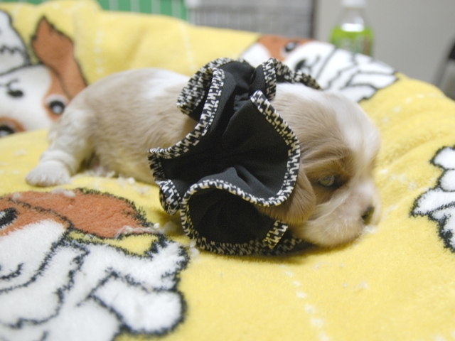 | コメント | お父さんはJKCチャンピオンの家斉君、お母さんはチャンピオン直子スザンヌちゃんからダンディな男の子です。(黒リボン君) 健康状態は、問題有りません。 すくすく育っています。 |
