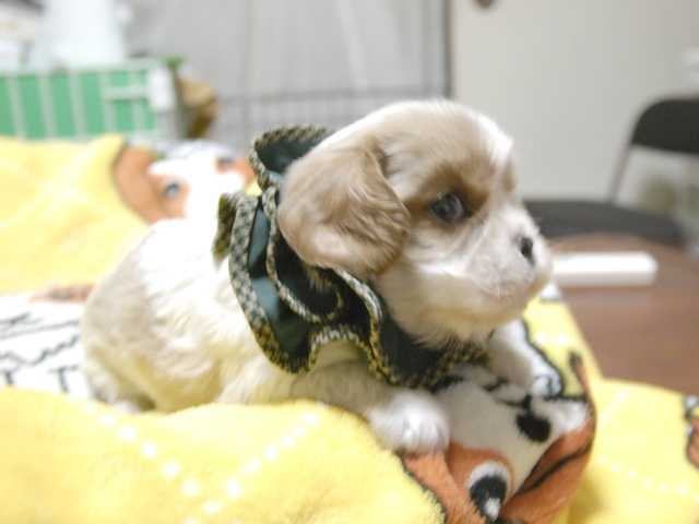 | コメント | お父さんはJKCチャンピオンの家斉君、お母さんはチャンピオン直子スザンヌちゃんからダンディな男の子です。(緑リボン君) 健康状態は、問題有りません。 すくすく育っています。 |