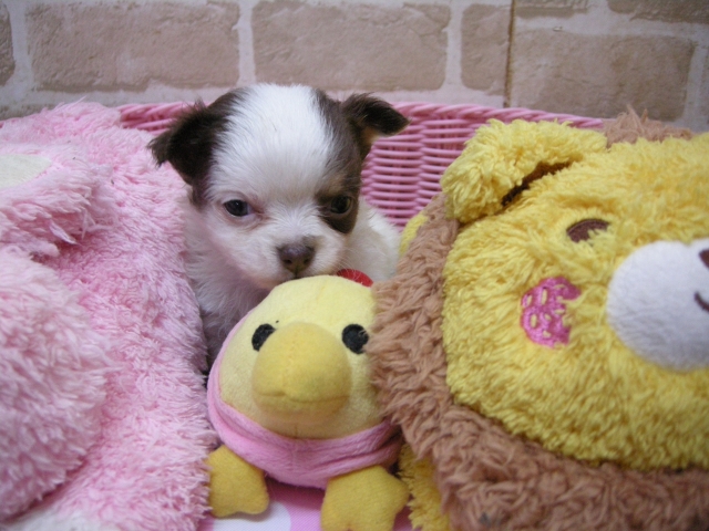 | コメント | お父さん『シン』君。PRAクリアーのチョコクリームのイケメン君!2.5㌔! お母さん『チロル』ちゃん!チョコタン&ホワイトの可愛い子2.3㌔! 可愛い小さなチワワになりますよ! 皆様からのお問い合わせ、ご見学お待ちしています! |