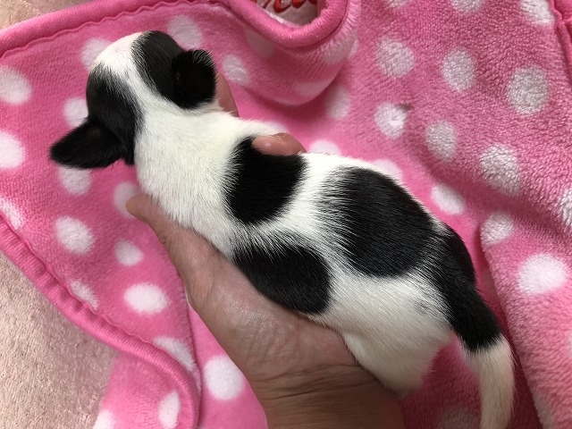 | コメント | パパ(JKC・CH直子クリーム) 2.4キロ ママ(ブラックタン&ホワイト) 2.2キロ 小ぶりで愛らしいスムースチワワの4兄妹が生まれました。 兄妹の中で唯一、とっても可愛い牛柄のパーティカラー♡ 白黒はっきりのスムチーちゃん。 成長が楽しみな美人ちゃんです! ※ 初回ワクチン代(5種混合) ※ フード1キロ ※ ワンちゃん母子手帳 ※ おもちゃ ※ 血統書代 上記5点のサービスがあり、表示価格以外の追加費用はございません。 ただしお届け希望等、送料がかかる場合は別途ご負担下さい。 この子を家族にしたい!と思って下さる優しいご家族様からの お問い合わせをお待ちしております♪ 購入意思のない方のお問い合わせ&ご見学はご遠慮下さい。 仔犬をお迎えするに当たっての、ご家族様での話し合いは 済ませておいてくださいね。 ご家族様全員が飼うことに同意されたうえで、 お問い合わせ下さいますようお願い致します。 |