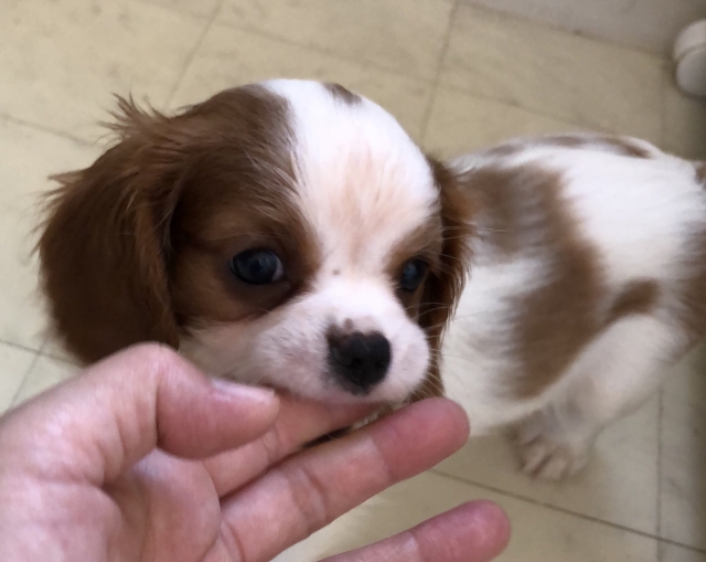 | コメント | とっても可愛い男の子です。 パパは英国系血統のブレンハイム7㎏ 骨太で地低くどっしり体形で毛量豊富なイケメンくん。 ママはブレンハイム5.5㎏ いかにも女の子っていうような、お鼻の短いとっても可愛い子。 産まれたときから、この子、絶対に可愛くなる!とビビビッときたのですが、案の定とっても可愛く成長しています♪ 左右対称のお顔の模様、頭頂部にはキャバリアの特徴であるローゼンジマークがしっかりと入っています。 背中の模様も白茶のバランスが良い感じに入っております。 コンパクトサイズになりそうです。 キャバリアのブリーディングを始めて18年、心臓疾患が出にくく、お顔の模様がキレイでお口回りにシミやソバカスが極力出ないように心掛けて代々繁殖しております。 成長過程で出やすいお口回りの斑点模様(ソバカス)は我が家の子たちは出ない子がとても多いです。 性格は明るくて人懐っこく尻尾フリフリ。 人も犬も大好きです。 遊んでいても私の姿を見つけると走ってきて愛想を振りまく可愛い性格をしています。 とっても人懐こく、良い性格の子に成長しています。 食欲旺盛で元気いっぱいに毎日お部屋の中を走ったり遊んだり、よく寝て過ごしています。 当方のブログやInstagramにはたくさんの画像や動画を掲載しています。 ワクチン摂取も済みましたのでご見学時に連れて帰ることも可能です。 気になることがございましたら、どのような小さなことでもお気軽にお尋ねください。 とっても可愛い子ですので、是非ご見学にいらしてくださいね~。 |