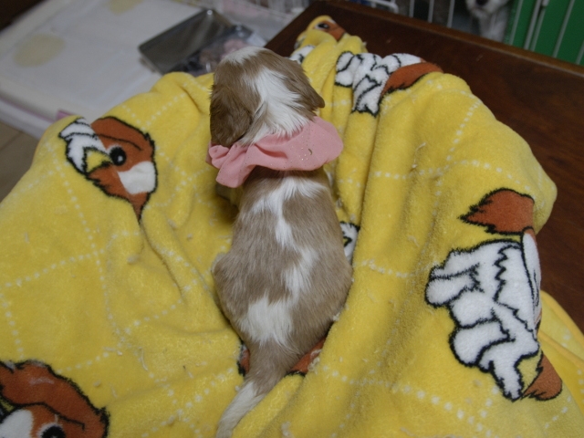 | コメント | お父さんはJKCチャンピオンの家斉君、お母さんはチャンピオン直子ライザちゃんから生まれたキュートな女の子です。(桃リボンちゃん) 健康状態は、問題有りません。 すくすく育っています。 |