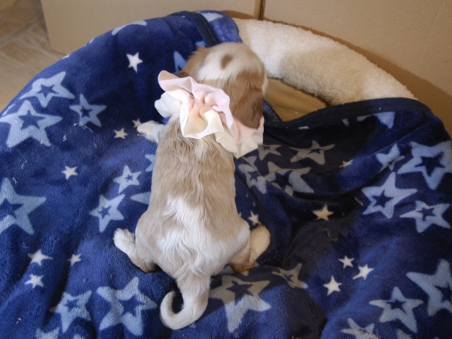 | コメント | お父さんはJKCチャンピオンの家斉君、お母さんはチャンピオン直子マーガレットちゃんから生まれたキュートな女の子です。(桃リボンちゃん) 健康状態は、問題有りません。 すくすく育っています。 |