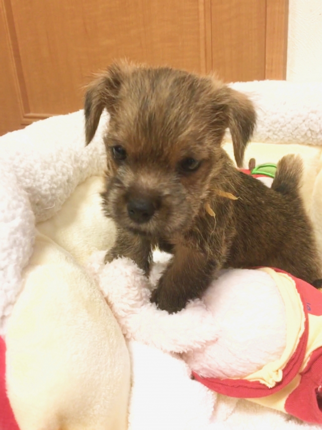 生後70日位で引き取りに参りました。 もっと早く受け取りたかったのですが、たまたま関西行く用事があり 直接引き取り参りました。 藤家さんに直接お会い出来、色々と飼育の方法等ご教授頂き助かりました。子犬はとても元気で東京に帰る時も一度もぐずらず長時間にま限らずおとなしくゲージの中におりました。 現在は、食事も3回食欲もあり元気に過ごしております。 乳歯が生えてきており歯が痒いのでしょう。私たちの指を歯固め代わりにじゃれております。 藤家さんの躾がいいのでちゃんとおしっこマットにするし今のところは満点です。 (東京都 男性)