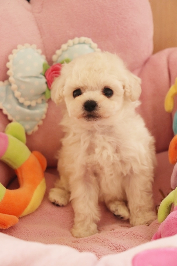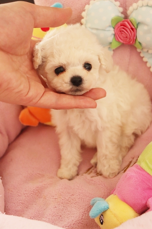 | コメント | ご覧いただきましてありがとうございます。 サイズが小さな小さなポケットサイズでお目目クリクリ、お顔も可愛い系の王子様のご紹介です。 将来のサイズ予想はティーカップサイズ予想になります。 沢山の豊富な毛量と短いお鼻に大きな大きなクリクリした瞳♥ ウルルとしていて見つめていると可愛すぎてやられてしまいます♥ お顔がとってもとっても可愛いので何をやっていても甘やかしちゃいそうな男の子君です。 ◆トイプードル(ティーカップサイズ予想) ◆男の子 ◆ホワイト ◆2018年7月27日生まれ ◆お父さん ホワイト(両親JKCチャンピオン、代々チャンピオン家系の良血統、2.0キロ、同胎の子はJKCチャンピオン) ◆お母さん ホワイト(代々チャンピオン家系の超良血統、1.4キロ) 現在、兄妹とお母さんと一緒に過ごしており愛情一杯に育っております。 サークル内でのおトイレはほぼ成功しております。 欧米諸国のブリーディングを見習い、お母さん犬や兄妹達と一緒に社会期を過ごさせることで人と暮らした時にスムーズに暮らせるように心がけております。 とっても賢くて人が大好きな子ですごく飼い易い子です。 初めての方も初めてじゃない方も多頭飼いの方にも自信を持ってお勧めできる男の子君です。 フードも離乳食を始めましたが好き嫌いせずちゃんと食べてくれるので食の心配もなく安心です。 体のサイズはとってもとっても小さいですが毛の量が半端なく豊富で凄いのでどんなカットでも似合いトリミングが楽しめます♪ 体もとっても小さいですが更にお顔もとっても小っちゃくお目目が大きくてクリクリで可愛いお顔が自慢。まるでテディベアの様にお顔も詰まってます!色は希少なホワイトカラーになります。 希少なホワイトのカラーで毛量抜群な子をお探しの方には特にお勧めです。毛量が豊富なのでトリミングで色んなカットが楽しめます。インスタ映えならぬトリミング映えする子です。 性格は人もわんちゃんも大好きなとってもフレンドリーな優しい子です。特に人は大大大好きな甘えっこちゃんです。 兄妹の子にも優しく接して遊んでます♪甘え上手な性格がとっても可愛いです。 健康状態は今の所全く問題なく体は小さいですが元気のいい子です。 PRAもクリアになります。 ☆見学、大歓迎です☆(事前にご予約下さい。) ☆東北自動車道 泉インターチェンジから10分 ☆JR東日本 東北新幹線仙台駅乗り換え 仙台市営地下鉄南北線泉中央駅から10分(東京~仙台間は最速の新幹線はやぶさ号で約1時間半です。) ☆遠方の方もお気軽にご相談下さい。 ☆沢山のお問い合わせお待ちしております。お気軽にお問い合わせ下さい。 |