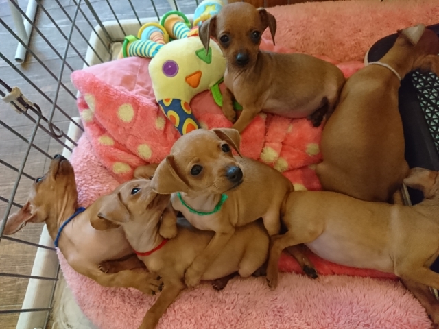 初めて犬を買うこと、飼うことを中村ブリーダーから出来て本当に良かった。私達家族三人は知識ゼロ、準備無し、ミニピンが欲しい気持ちだけで子犬を観に行きました。そんな私達でも、たった三、四日の準備期間で子犬を受け入れることが出来ました。と言うのも中村夫妻が部屋の環境から用品まで細かく教えてくれたおかげ。しかも用品店まで出張してもらい、使い勝手の良い物を買い揃えることが出来ました。そして、何よりも肝心のミニピンですが、目当ての子は勿論超かわいい、兄妹の子もまた良し。結局その二頭に迷いに迷い、四時間位中村夫妻とおしゃべり。印象的だったのは「こういうのは出会いなので うちの子じゃなくてもいいんですよ」と商売っ気無し。犬に対する深い愛情や育て方、お人柄も解り、安心してメス一頭購入。引き取りの時、さみしげに見えた中村夫妻、「大事にします」と、私は心に誓った。信用出来ます。(千葉県 男性)