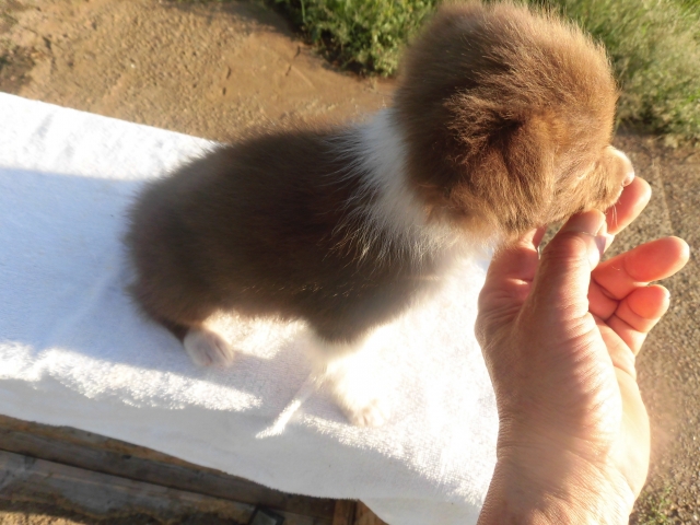 | コメント | 父親/ブラック&ホワイト・インターチャンピオン孫(19㎏) 母親/レッド&ホワイト・訓練チャンピオン孫(18㎏) DNA検査済み、ノーマルです。 性格の良い子に育ちます、家庭犬・競技会犬に如何でしょうか。 首回りは1周回ったフルカラーです。 |