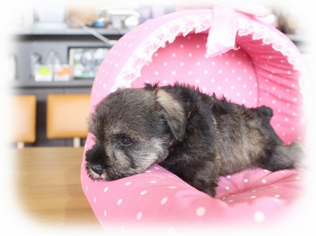 シュナウザーを主力にされているブリーダーさんだと認識しており、ボスちゃんはどうかなあと正直不安でしたがとても可愛く健康的なボスちゃんをいただきました。 掲載されていた写真より実物は想像以上に可愛くて即決し見学させていただいたその日に連れて帰りました。連絡をして、翌日行きますぅって勝手な申し出にも関わらず敏速かつ親切に対応して頂き大満足です。契約に対しても一つ一つ丁寧に説明してくださり、わかりやすかったです。この度は可愛いボスちゃんとのご縁をいただき、本当に有り難うございました。 (大阪府 女性)