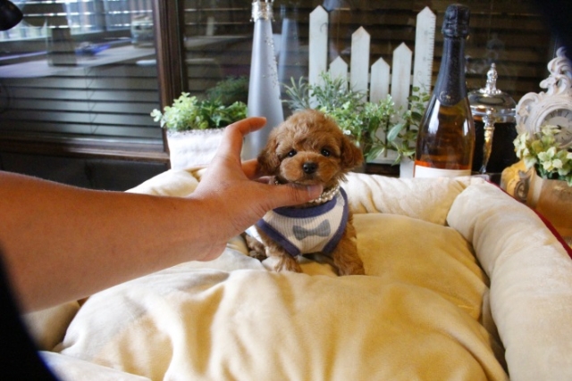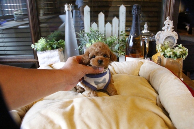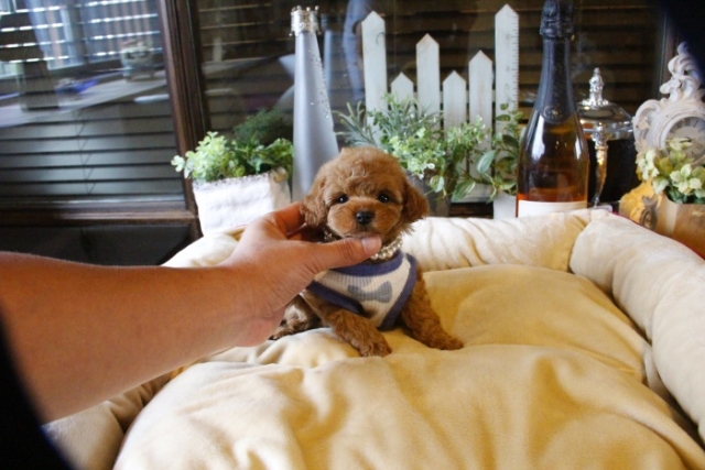 本日、我が家に小さな可愛い女の子のトイプードルがやって来ました。 遠距離という事もあり、暑い時期、飛行機の事なども心配していましだが、家に着いた途端、元気に走り、食欲も旺盛で、今まで大切に育てられてきたのだなぁ、ということがよくわかりました。 連休中にも関わらず、戸田様には、伊丹空港まで連れて来て頂き、こちらの質問にも的確に答えて下さいました。 大変信頼できるブリーダーです。 遠距離で悩まれている方も、安心して新しい家族を迎えられますよ。(兵庫県 男性)