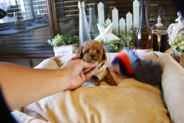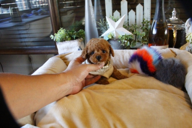 本日、我が家に小さな可愛い女の子のトイプードルがやって来ました。 遠距離という事もあり、暑い時期、飛行機の事なども心配していましだが、家に着いた途端、元気に走り、食欲も旺盛で、今まで大切に育てられてきたのだなぁ、ということがよくわかりました。 連休中にも関わらず、戸田様には、伊丹空港まで連れて来て頂き、こちらの質問にも的確に答えて下さいました。 大変信頼できるブリーダーです。 遠距離で悩まれている方も、安心して新しい家族を迎えられますよ。(兵庫県 男性)