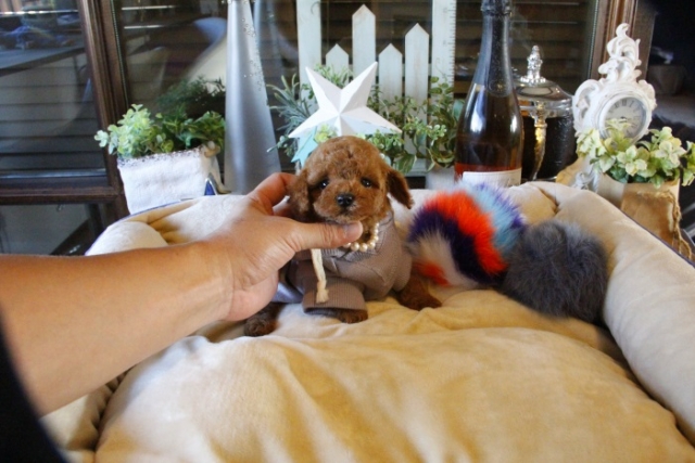 本日、我が家に小さな可愛い女の子のトイプードルがやって来ました。 遠距離という事もあり、暑い時期、飛行機の事なども心配していましだが、家に着いた途端、元気に走り、食欲も旺盛で、今まで大切に育てられてきたのだなぁ、ということがよくわかりました。 連休中にも関わらず、戸田様には、伊丹空港まで連れて来て頂き、こちらの質問にも的確に答えて下さいました。 大変信頼できるブリーダーです。 遠距離で悩まれている方も、安心して新しい家族を迎えられますよ。(兵庫県 男性)