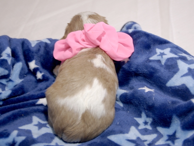 | コメント | お父さんはJKCチャンピオンの家重君、お母さんはチャンピオン直子カーラちゃんから生まれたダンディな男の子です。(桃リボン君) 健康状態は、問題有りません。 すくすく育っています。 |