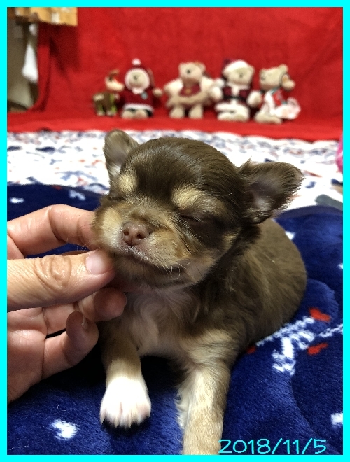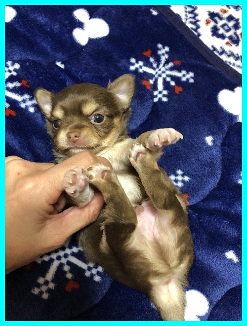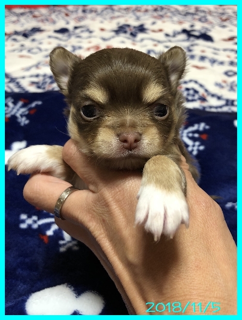 | コメント | パパはJKCチャンピオン直子の北斗【ほくと】君 ママはJKCチャンピオン直娘のアンバーちゃん。 両親共に2キロちょっとの小さなチワワちゃんです。 一人っ子ちゃんで帝王切開で生まれました。 ママのおっぱいを一人占めしてムチムチに育っています。 両親共にとても性格の良い明るく人懐こいチワワちゃんです。 将来的なサイズは2キロくらいかと思います。 生後30日で3種混合ワクチン、50日で健康診断と6種混合ワクチンを接種してから生後60日頃よりお引き渡しが可能となります。 ぜひ良いご縁があってくれればと思いますので、お問い合わせやご見学のご連絡をお待ちしております。 素敵なご縁がありますように・・・・ |